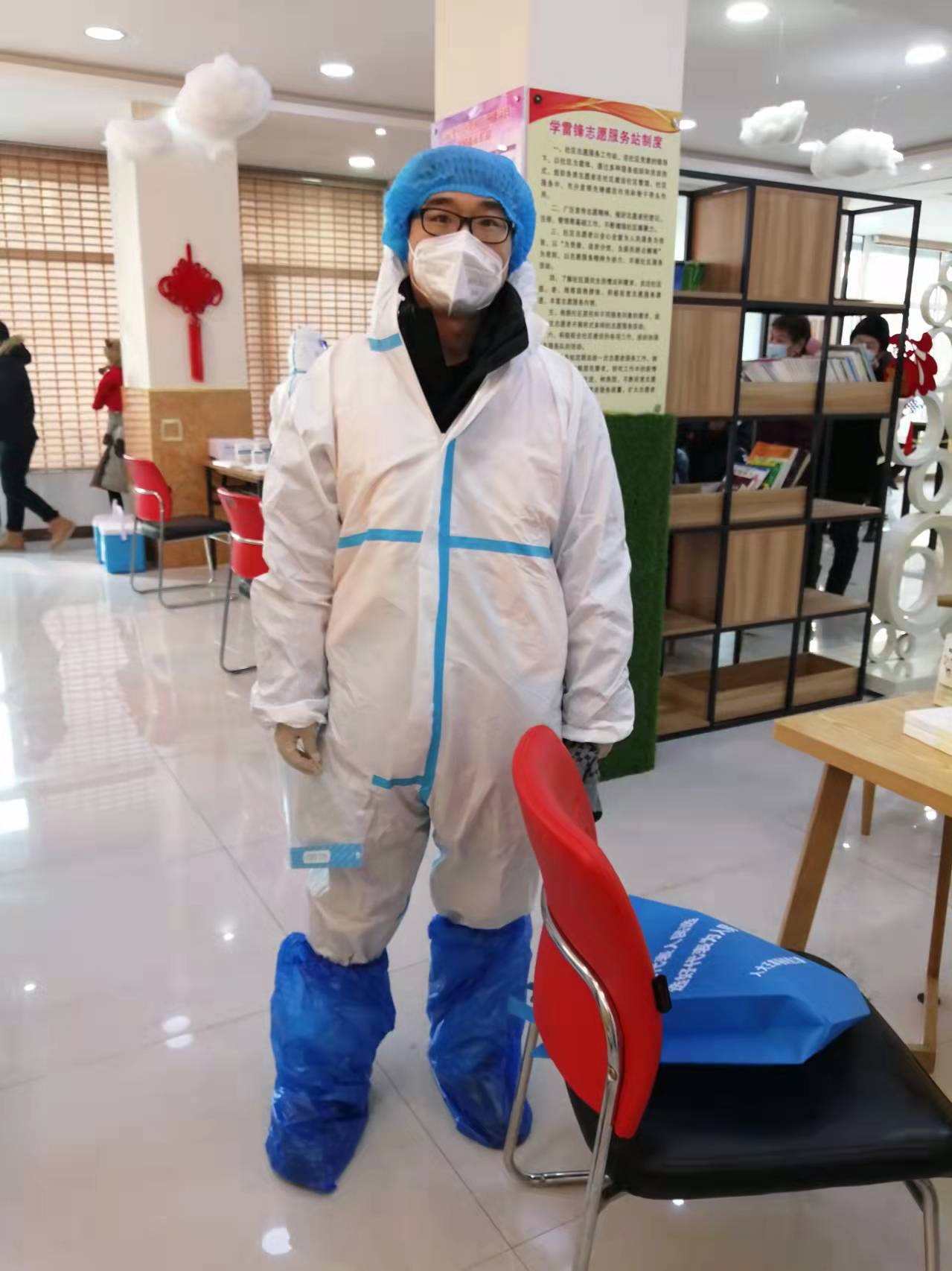 专业教师、文博及旅游管理系教师党支部戴玥老师一早就到河北区容彩里社区进行报到,参加社区第三次大筛的志愿服务活动,在户外对参加筛查的人员进行引导并维持秩序。工作需要一直穿着防护服,不过一个上午,全身都已经湿透了。戴老师表示,通过参与一线志愿服务,不仅看到了政府的投入和广大群众的积极配合,也看到了政府和人民群众抗击疫情的决心,同时也体会到“白衣战士”的艰辛,更加坚定的相信我们定能取得此次抗疫的胜利。