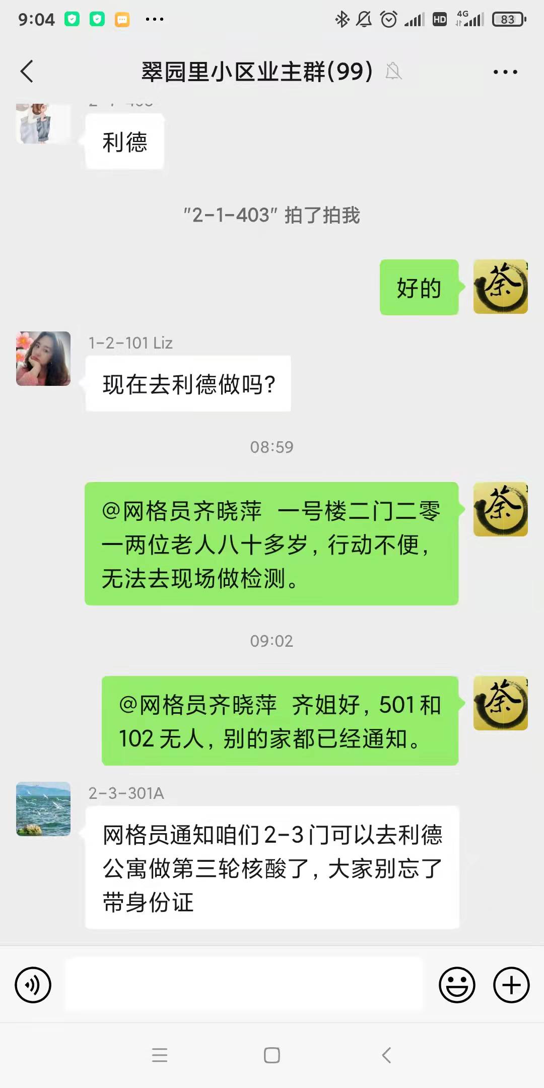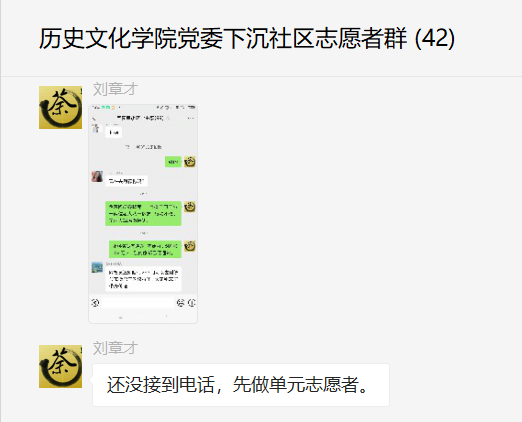 专业教师,世界史教师支部教师刘章才暂时没有被分配到去现场进行志愿服务,但是秉持着为人民服务的精神,主动承担了单元志愿者的工作,在小区微信群里通知大筛进度,守着手机随时解决群里提出的问题并进行意见的反馈,协助疫情筛查尽量不出现空挡,保证筛查顺利。刘老师表示,疫情当前,作为一名党员,为群众服务义不容辞。