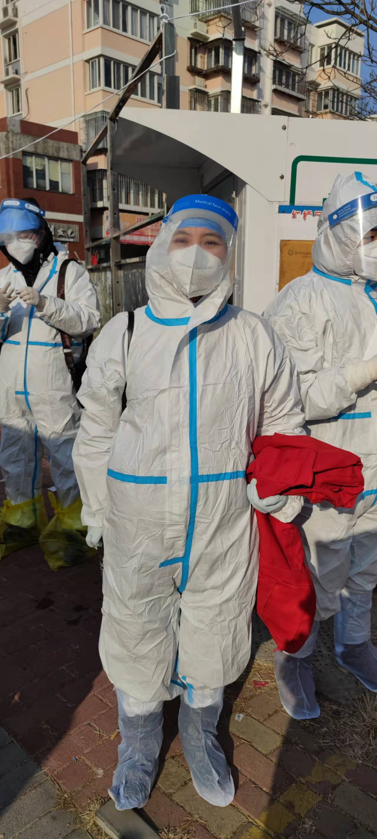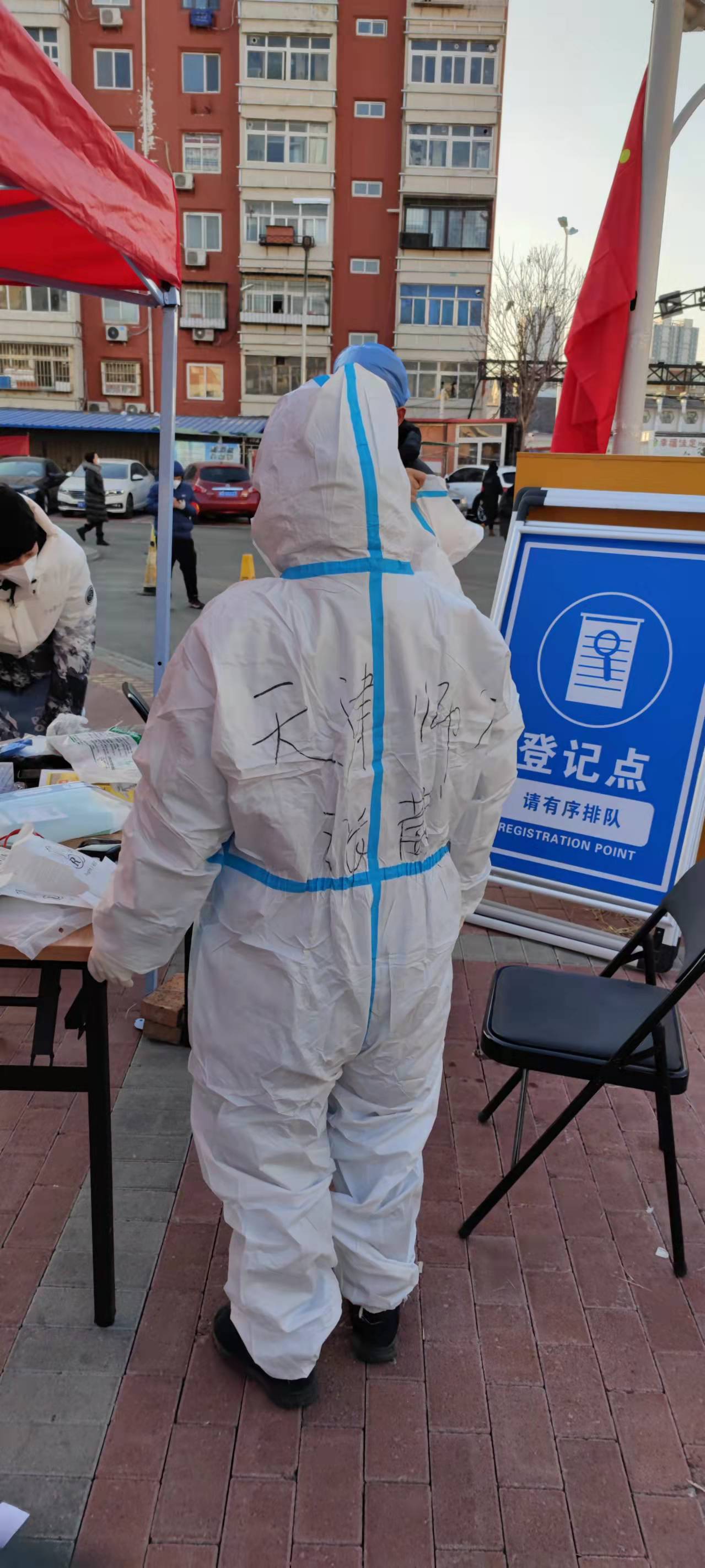 专业教师,中国史教师党支部教师张葳也是连续多天到红桥区邵公庄街道仁爱社区报到,负责信息采集与录入工作。由于工作需要,一整天都要穿着厚厚的防护服,不到半天就是一身汗;任务繁重,休息时间甚少,而且身处户外环境,风一吹就是透心凉。但是张老师表示,这些都不算什么,而且身为一名共产党员,此时就是要站出来承担责任,为人民服务。