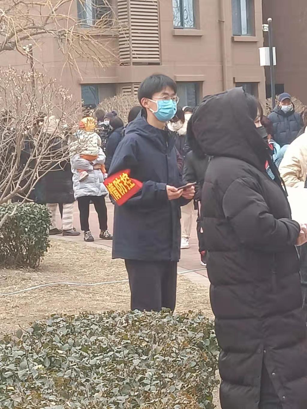 2001穆彤,在天津市西青区杨柳青镇莱茵小镇社区参与疫情防控志愿服务活动。