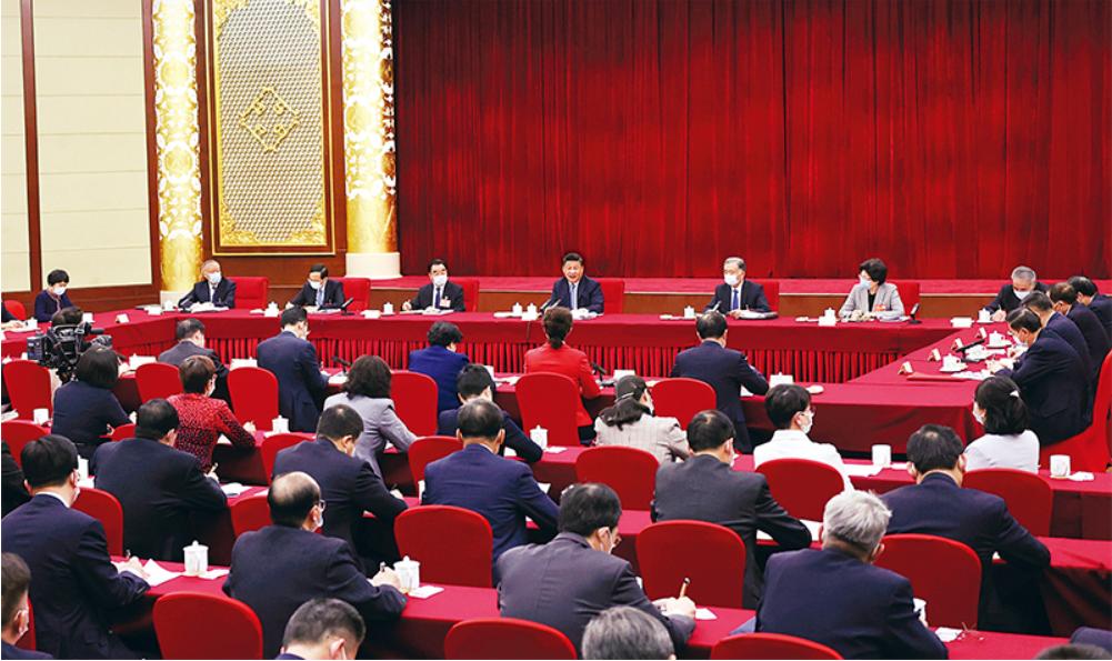 2022年3月6日,中共中央总书记、国家主席、中央军委主席习近平看望参加全国政协十三届五次会议的农业界、社会福利和社会保障界委员,并参加联组会,听取意见和建议。中共中央政治局常委、全国政协主席汪洋参加看望和讨论。 新华社记者 王晔/摄