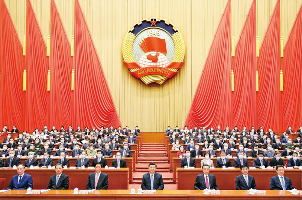 2022年3月4日,中国人民政治协商会议第十三届全国委员会第五次会议在北京人民大会堂开幕。这是习近平、李克强、栗战书、王沪宁、赵乐际、韩正、王岐山在主席台就座,汪洋代表政协第十三届全国委员会常务委员会向大会报告工作。 新华社记者 黄敬文/摄