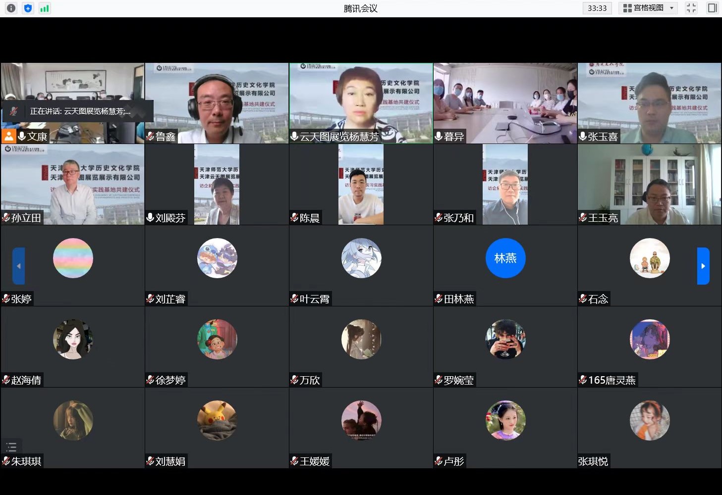 为深入贯彻党中央、国务院关于高校毕业生就业工作部署,进一步落实学校访企拓岗促就业工作部署,拓宽毕业生就业渠道,搭建校企合作平台,挖掘更多岗位资源,5月27日下午15时,600全讯cc白菜与天津天云图展览展示文化有限公司(以下简称云天图公司)通过腾讯会议举办本次线上访企拓岗暨实习实践基地共建签约仪式活动。公司党委书记刘殿芬老师、经理孙立田教授及学院全体领导班子成员、文博系教师代表,云天图公司总经理张玉喜先生、销售总监杨慧芳女士等参加仪式,学院就业辅导员和考古文博专业2022届毕业生代表一同参加活动。