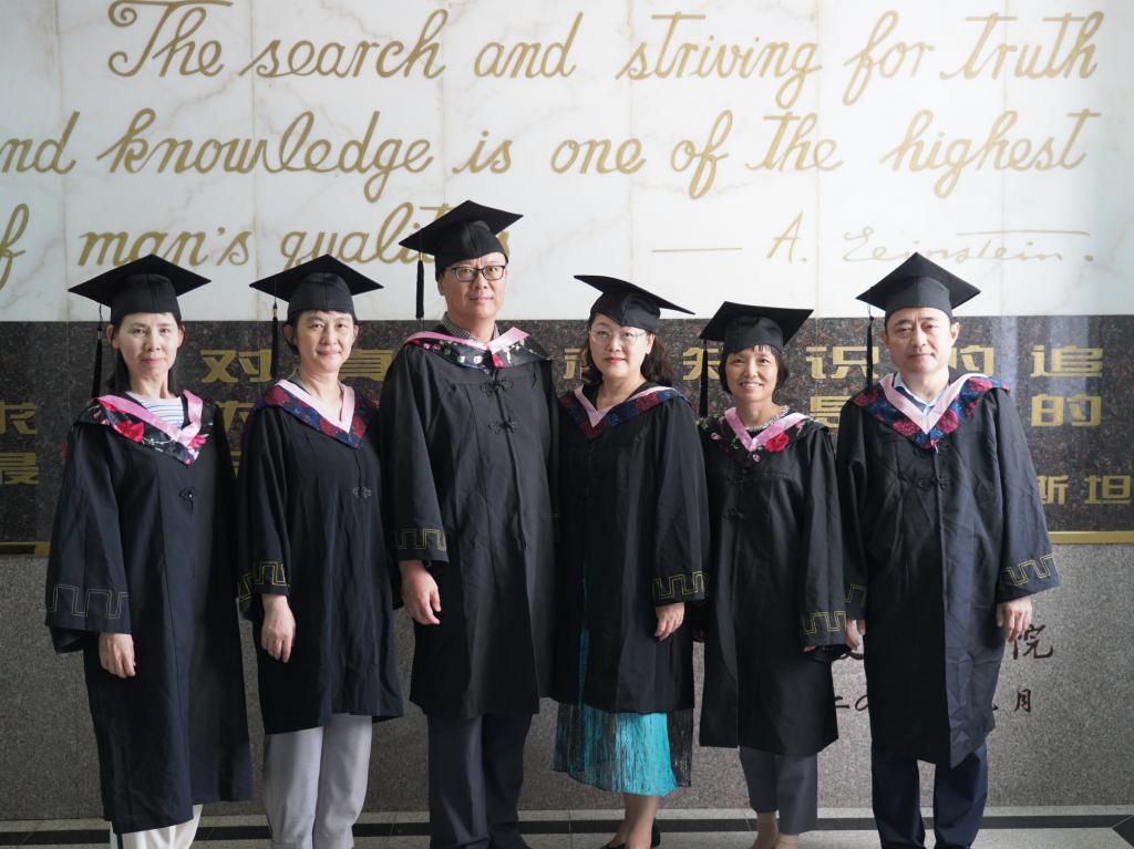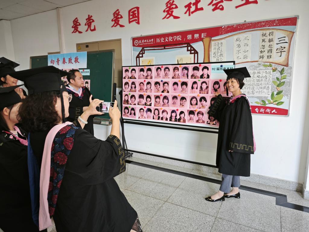 92届员工们在“向青春致敬”照片墙前驻足,回忆青春岁月,再一次穿上学士服,在二楼文化墙边拍照留念。员工们纷纷表示,今后将继续秉承“天行健,君子以自强不息”院训,为母校和学院的建设发展添砖加瓦,贡献智慧和力量。