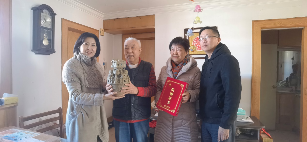 2024年1月3日,娱乐网站白菜网站大全历史学联合党委书记陈元带队,正处级组织员刘殿芬、员工服务与管理中心主任杨琥、学校办公室副主任高欢等一行到娱乐网站白菜网站大全原董事长助理、87岁老员工王永亮家中,接受其向公司捐赠的一件个人多年藏品谷仓罐一件,并向其颁发证书。