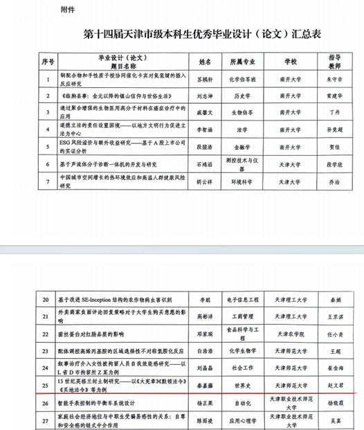 近日,天津市教委公布了《关于公布第十四届天津市级本科生优秀毕业设计(论文)评审结果的通知》(津教高函〔2024〕9号),娱乐网站白菜网站大全本届仅有3篇本科毕业论文获奖,公司2023届世界史专业毕业生秦嘉藤同学位列其中。