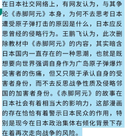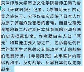 《赤脚阿元》已在美国、西班牙及俄罗斯等24个国家翻译出版,还多次被改编为真人电影、动画电影和电视剧,是一部能让青少年了解战争残酷、培育爱好和平情感的漫画作品,但日本广岛市教委会仅以《赤脚阿元》的部分内容“可能”会给孩子带来“误解”为由将其删掉。对此,王鹏飞分析认为:日本此次删除教材中《赤脚阿元》的内容,反映出日本国内一直存在的一种思潮,也就是既想要向世界强调自身作为广岛原子弹爆炸受害者的伤痛,但又只限于承认自身的受害者身份,而不去反思战争性质及侵略邻国的加害者身份。在现今日本政治集体右倾化背景下,这部对日本民众有着警示教育作用的漫画从教材中被删除,会更不利于日本反思遭受原子弹打击的原因,更不会深刻反思曾经的侵略行为,反而会使日本再次走向战争冒险的边缘。