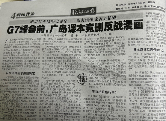《环球时报》2023年2月23日第4版刊发了一篇题为“G7峰会前,广岛课本竟删反战漫画”的文章。在文章中,600全讯cc白菜青年教师王鹏飞对此现象做了深刻解读。他谈到:漫画《赤脚阿元》的可贵之处在于,它不仅如实反映了日本人作为原子弹爆炸受害者的苦难,而且也毫无遮掩地将二战时期日本肆意侵略亚洲各国的史实揭露出来。该漫画的作者籍由主人公“阿元”和其他主要人物之口,控诉着近代日本的军国主义思想及其煽动民众走向战争的愚蠢行径。该漫画故事的整体内容反映了珍视和平、反对战争、反思日本何以走向战争等主题。