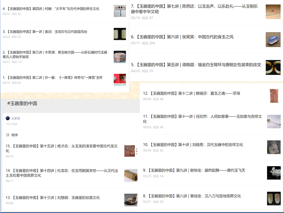 在石洪波老师讲解中国古代玉器发展史的基础上,同学们在“玉器里的中国”这一主题之下,自行选择角度完成课后作业,再通过主动申请和教师选择相结合的方式,共有15位同学在课堂展示了自己对“玉器里的中国”这一主题的理解。这些课堂展示的内容均以原创形式公开发表在微信公众号“云史话”上。部分同学因选题较好,经推荐,将作为主讲嘉宾出席《天津文艺广播》午间文博节目《文博不打盹儿》,向天津市民普及古代玉器知识。其中,姜润同学的选题“玉双卯与汉代驱疫风俗”已于2022年4月8日播讲,取得了较好的反响,得到了电台方的认可。