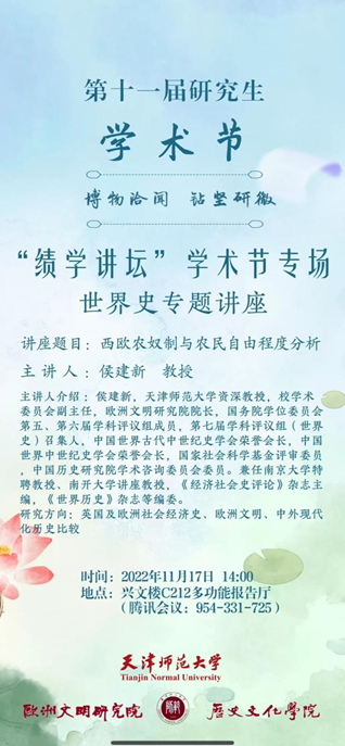 2022年11月17日,侯建新教授将为两院师生带来题为《西欧农奴制与农民自由程度分析》的学术讲座,讲座详情见海报。