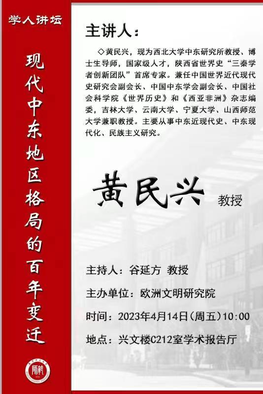 日,黄民兴教授将为两院师生带来题为《现代中东地区格局的百年变迁》的学术讲座,讲座详情见海报。