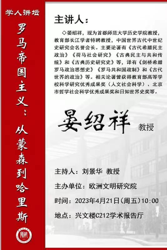 日,晏绍祥教授将为两院师生带来题为《罗马帝国主义:从蒙森到哈里斯》的学术讲座,讲座详情见海报。