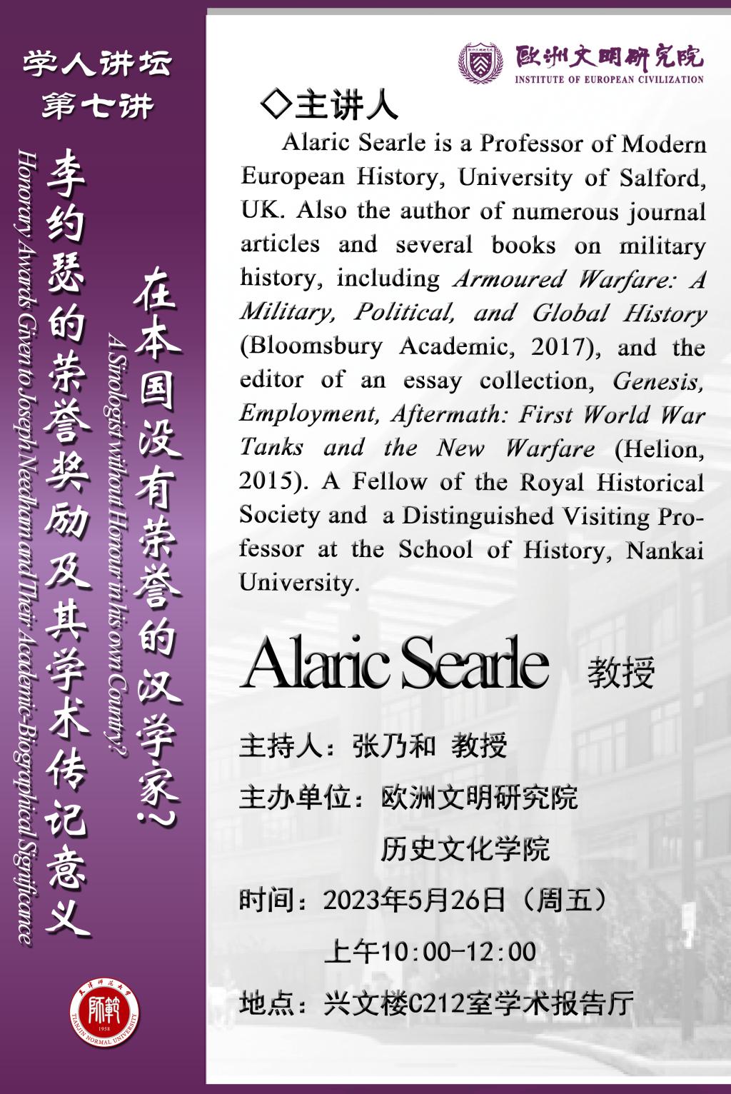 2023年5月26日,Alaric Searle教授将为两院师生带来题为《A Sinologist without Honour in his Own Country? 》的学术讲座,讲座详情见海报。