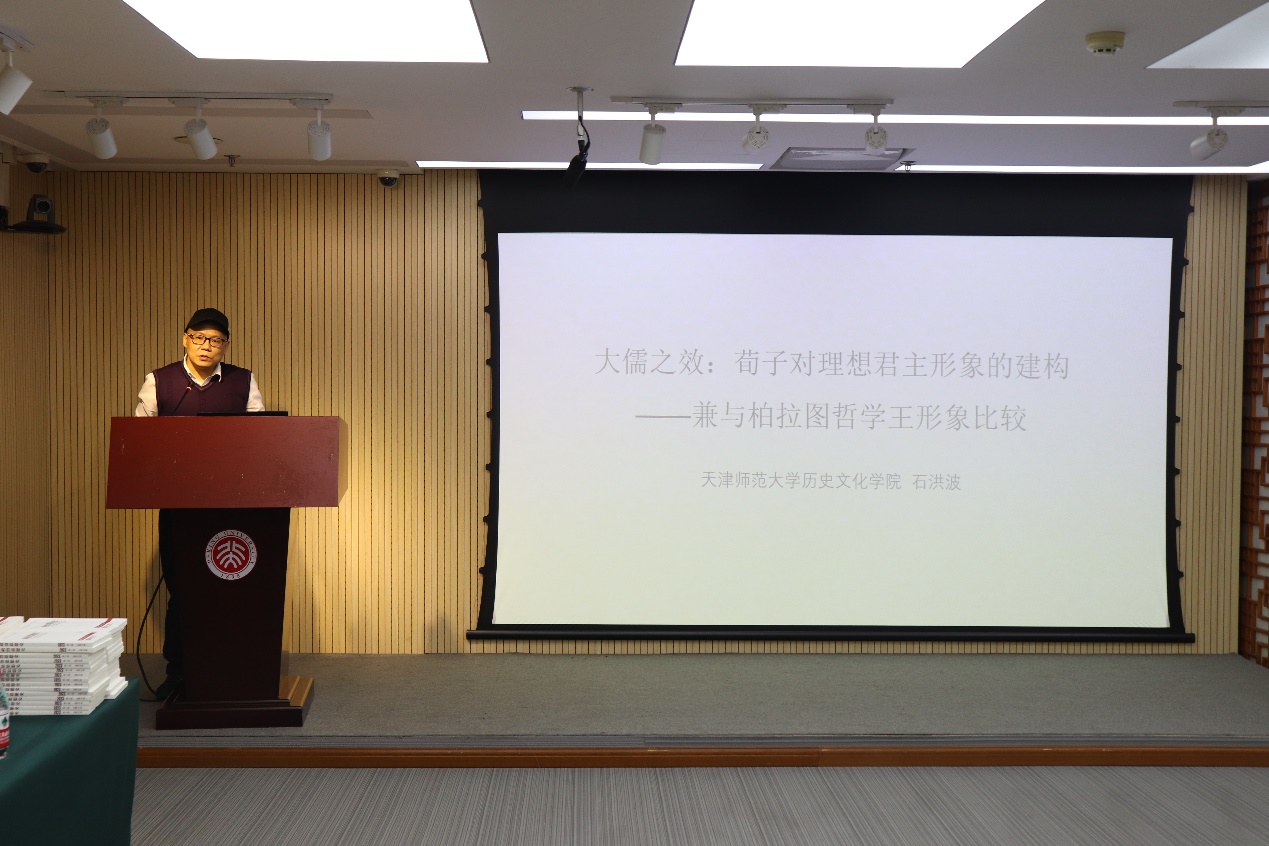 石洪波在会议中发言题目是《大儒之效:荀子对理想君主形象的建构——兼与柏拉图哲学王形象比较》,以荀子晚年提出的“大儒”概念为研究对象,分析了“大儒”的内涵与外延与治国方式,指出:“大儒”是荀子在轴心时代的社会转型过程中,为了应对剧烈变化的战国历史,在探寻理想的治国模式过程中最终构建出来的,实现了对先王、后王的否定与整合,与同时代的柏拉图所构建的“哲学王”颇有异曲同工之妙,但“大儒”内蕴的深重历史沉淀却是哲学王所不具备的,这一差异在一定程度上体现了东西方文明的根本区别。
