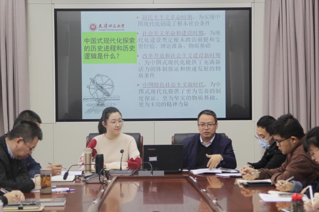 世界史教师党支部支委杜宪兵同志以中国式现代化的历史理解为切入点,探讨中国式现代化的世界历史意义。他认为,现代是一种时间概念,现代性是一种状态概念,而现代化是一个过程概念,要以此深入把握中国式现代化蕴含的独特历史观。此外,还提出了“学术研究与现实关怀的关系”“如何超越时空研究中国式现代化”两个关键问题,打开了研讨新思路。