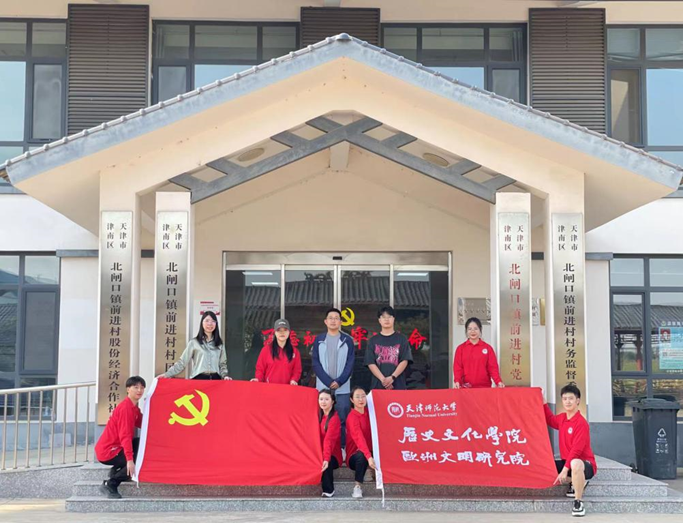 在津南区北闸口镇前进村党群服务中心,实践团成员通过了解乡村振兴事迹、体验便民农家书屋、观察乡村十年变化,深刻感受到乡村振兴战略的伟大意义和前进村的历史性变革,切身体会到新时代十年乡村建设的伟大成就。在亲垦农场和前进村村史馆,实践团成员通过对与当地村民的采访交流,深入了解了解到当地擦亮品牌、完善设施、村民互助,乡风建设等致富举措,激发了实践团成员对“乡风助力+技术完善”模式的探索热情。在北闸口镇退役军人之家,实践团成员倾听学习了津南红色故事和抗美援朝“老兵”的光荣事迹,通过观看长征题材纪录片,重温长征之路、感受长征精神。实践团全体党员面向党旗宣誓、重温入党誓词,进一步深化了对红色精神的理解,坚定了“听党话,跟党走”的理想信念。