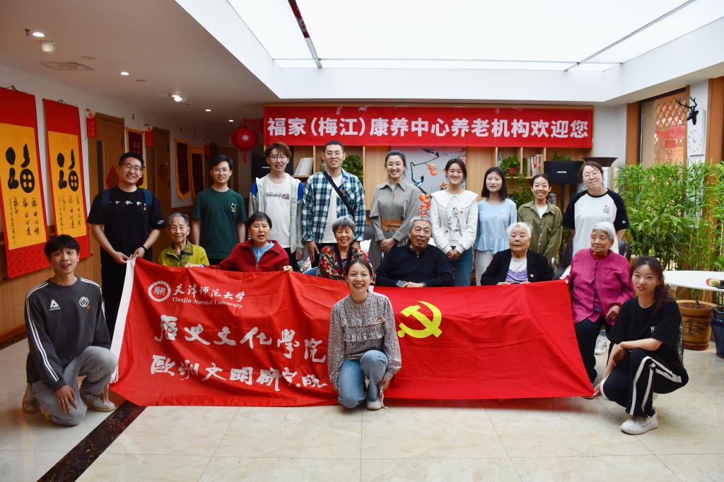 世界史研究生党支部成员走进天津梅江福家康养中心养老院开展“情系夕阳 爱暖人心”主题实践活动,支部党员们以“中国式现代化”为主题,围绕什么是中国式现代化、中国现代化探索的历程、中国式现代化特征和内涵等方面,与老党员们共同学习研讨。伴随着欢快的音乐,师生党员带领爷爷奶奶学做手指操,一同歌唱,并用甲骨文书写“老吾老以及人之老”赠予老人。现场其乐融融,老人们在其中体验快乐、收获健康。