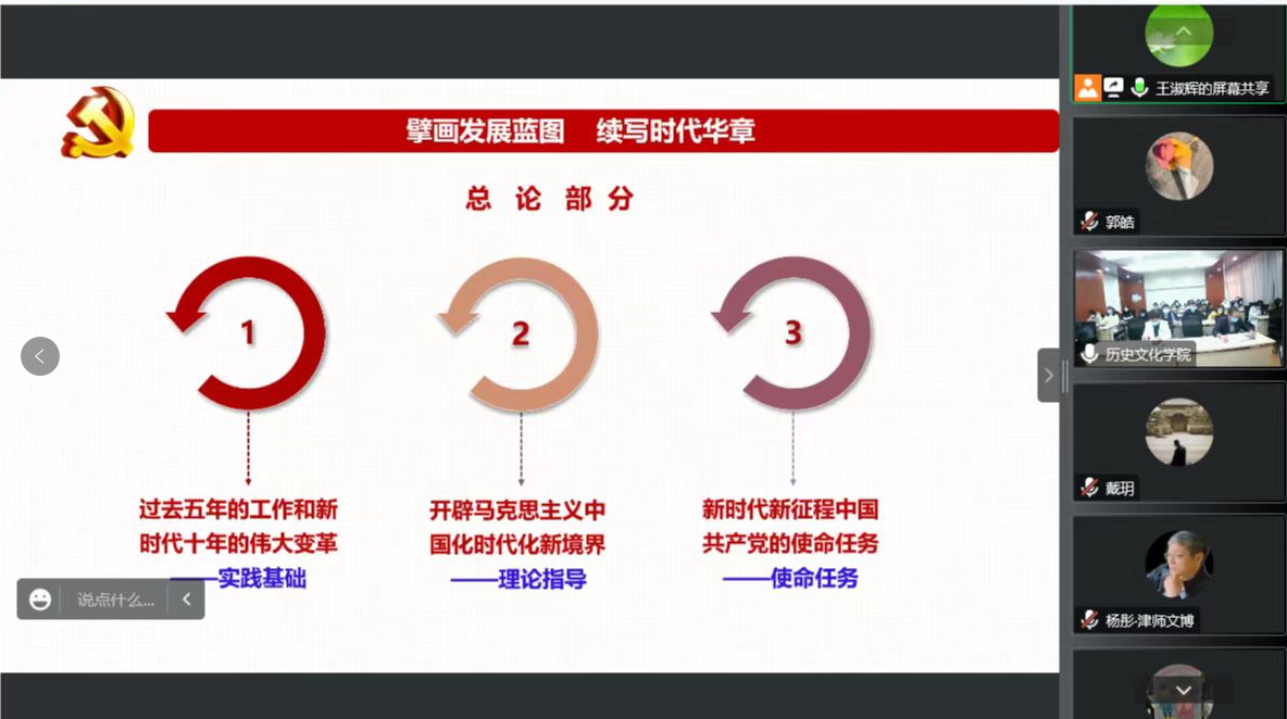 王淑辉老师以《擘画发展蓝图 续写时代华章》为题,从“过去10年党和国家取得的成绩”、“为什么能够取得这些成绩”,以及“未来我们要实现什么目标”和“如何实现这些目标”等四个方面,对党的二十大精神进行了全面宣讲。