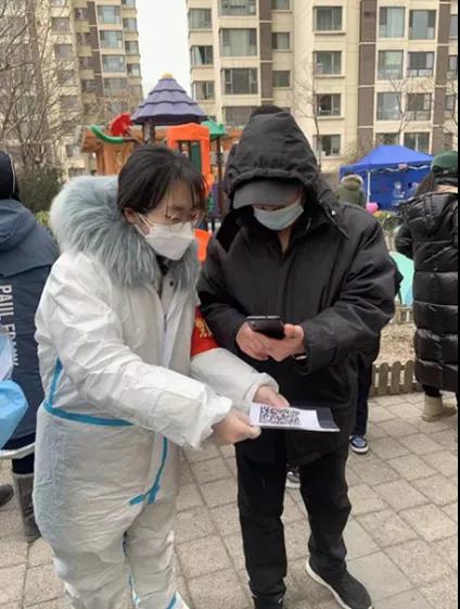 1903班班长从思琪同学在听到社区要有序开展疫情筛查工作后,立刻向社区报名了志愿者。她主要的工作是帮助大家扫码填信息,耐心地为年龄较大的爷爷奶奶填写做核酸需要的二维码信息,以便筛查工作快速有序地进行。在此次志愿服务中她深深感受到工作人员的辛苦以及社区居民带来的温暖。