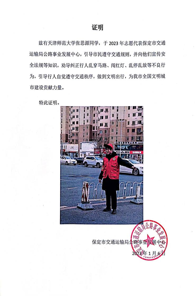 2104班的张思源同学积极参与保定市交通运输局公路事业发展中心的义工活动,成为了一名公路志愿者。在志愿服务过程中,他身着鲜艳的红色志愿服,于冬日瑟瑟寒风中长站路边,积极引导市民文明出行,宣传交通安全法规,劝导了行人乱穿马路、骑车逆行等不良行为。他说“这次志愿活动使我的组织和沟通能力都得到了锻炼,也对交通法规更深层次的了解,能为家乡参与文明城市建设贡献一份绵薄之力,这就是最令我感动的事了。”