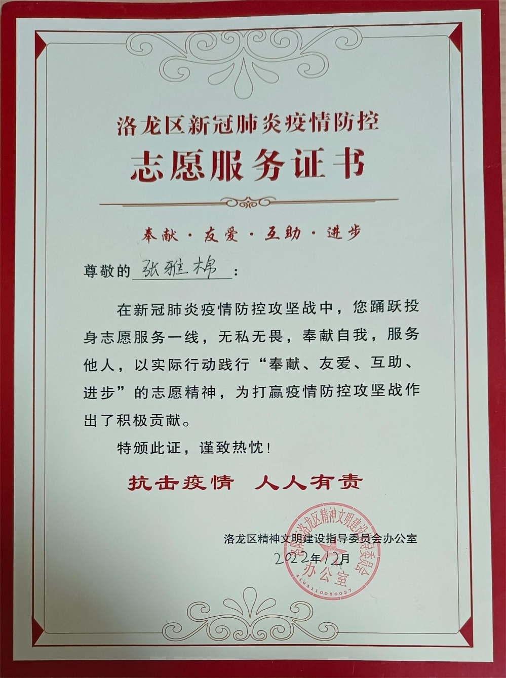 2203班的杨之焕同学,在2022年末参加了社区最后一次组织核酸检测筛查的志愿服务。在凛冽的寒风中跟随队伍一同前往协助居民扫码。为了体恤体弱多病的老年人,他们还承担了为腿脚不方便的老人进行上门检测的任务。他表示:即便很冷但听到爷爷奶奶们那句“你们辛苦了”的时候只觉温暖渗入心涧,通过本次志愿服务活动,他深刻体会到了基层工作者的不易和勇于奉献的内涵。希望在今后的生活中,继续将奉献社会的精神发扬下去,争做新时代“雷锋”。