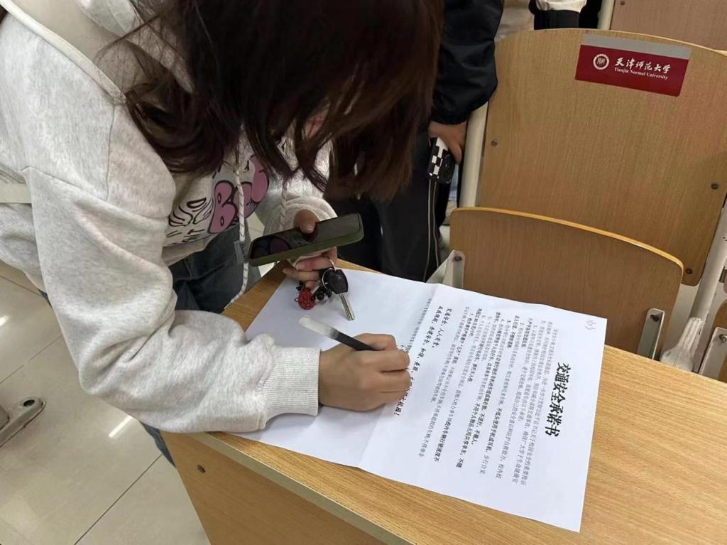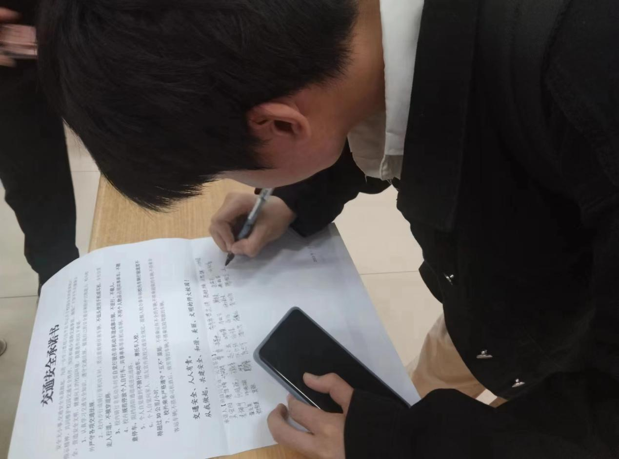 逐一签署校园交通安全承诺书,强化责任担当。各班主题班会后,班主任及员工干部组织全班同学逐一签署校园交通安全承诺书,再次提醒全体员工关注交通安全,关注自身安全。通过安全承诺书的签订,全体员工进一步强化了安全责任意识,将自觉遵守交通安全落实到实际行动当中。
