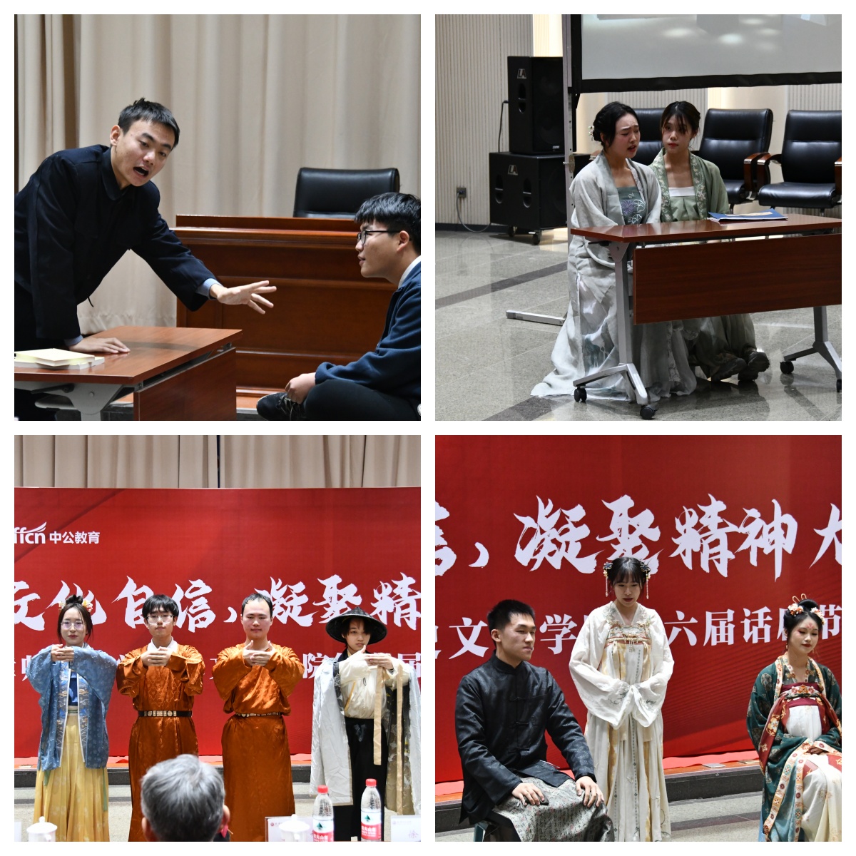 话剧节上,十二只参赛团队自发组织、精心准备,为大家展示了时空背景各异,表现形式纷纭、意蕴深刻的话剧表演。其中,《文脉长存·梅子青》《墨染长烟》《朝灯》聚焦失落文物,借器皿之口的呢喃细语讲述了文物有情,文脉长存的故事;《游园惊梦》《愿为江水,与君重逢》《浪淘沙》的故事为我们展示了古代文人家国天下的情怀,面对现实纠缠中迷惘的困惑,以及最终他们不忘初心、坚守道义的抉择;也有《师说》《杏林堂》《念故乡》等一系列关注乱世下中国知识分子心怀天下,用个体的努力为时代作注的故事。话剧节闭幕式上,学院还特邀文学院阳光话剧社出演了以反腐为主题的话剧《雷霆》,深化了大家对新时代廉政文化的人数。