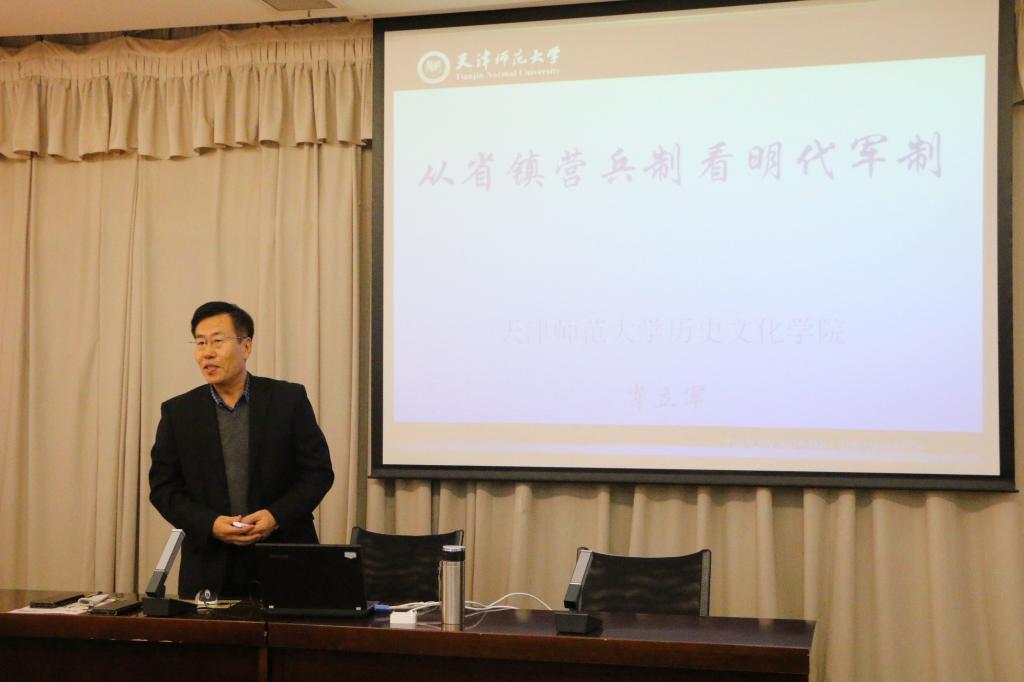 开幕式结束后,本届学术节首场讲座顺利举行。600全讯cc白菜中国史系主任、中国史一级学科带头人、博士生导师肖立军教授为两院研究生题为《从省镇营兵制看明代军制》的主题讲座。肖立军教授在明代军事制度的研究中,开创性地提出省镇营兵制的概念。他详细介绍了省镇营兵制度的内容,阐释了省镇营兵制与卫所制、与京营制的关系以及明代军制的演变过程。讲座尾声,肖教授耐心解答了同学们的疑问,并交流了对明代军事史的新看法、新观点,同学们都深感受益良多。