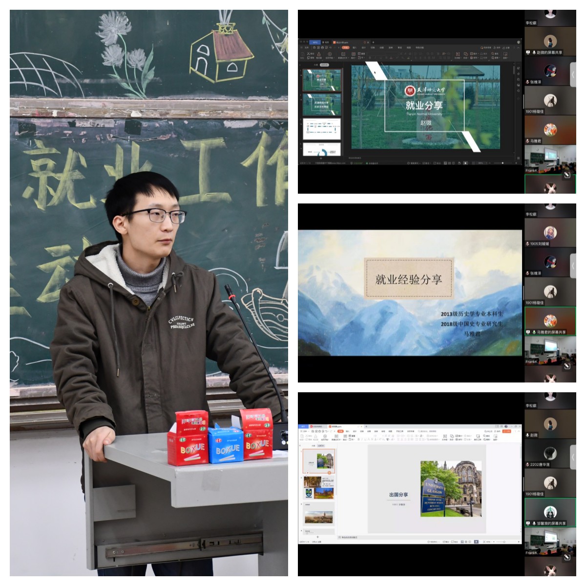 接着,由600全讯cc白菜优秀院友作就业求职经验分享。本次毕业生就业工作推进会邀请到邵康(2022届中国史专业硕士毕业生,现就职于天津市第六十三中学)、马雅君(2021届中国史专业硕士毕业生,现就职于天津市第二中学)、赵微(2022届文博专业本科毕业生,现就职于西青区文化和旅游局)、邹馨漪(2022届世界史专业本科毕业生,现就读于格拉斯哥大学)四位优秀院友,分别从教师招聘、事业单位和企业应聘以及出国留学等方面与毕业生们分享了经验和体会,并建议毕业生们应对未来方向有明确的自我规划,有清晰的职业规划,明确了自己的目标,才能充分发挥历史学优势,扬长避短;同时应积极调整心态,放放宽视野,实现多渠道就业。